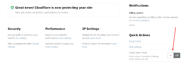 Dan silahkan Cek kembali situs kamu nah apabila kamu tidak ingin mengaktifkan fitur tersebut kamu bisa off kan kembali namun apabila ada serangan DDOS dari hacker kamu bisa aktifkan fitur tersebut agar website kamu tidak down.